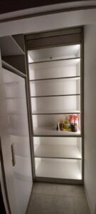Projektując kuchnię czy garderobę, można zainwestować w oświetlenie LED wewnątrz szafek lub zastosować wysuwane kosze cargo, które ułatwią organizację.